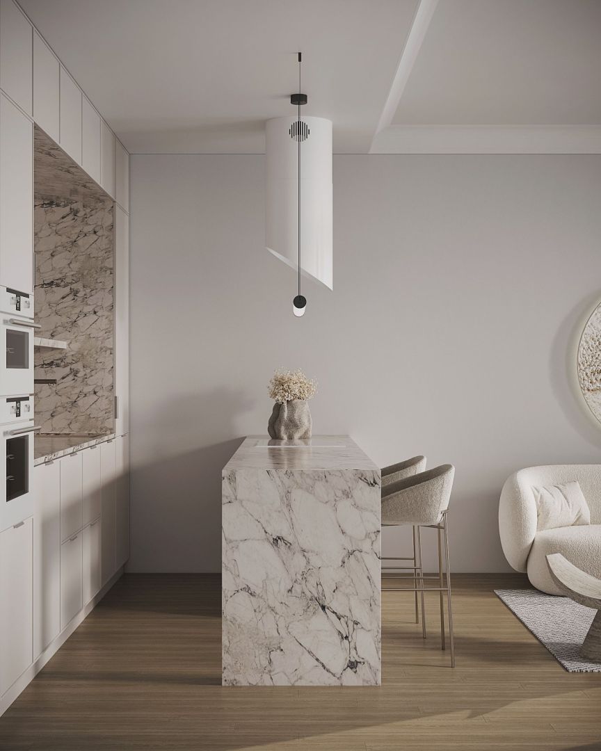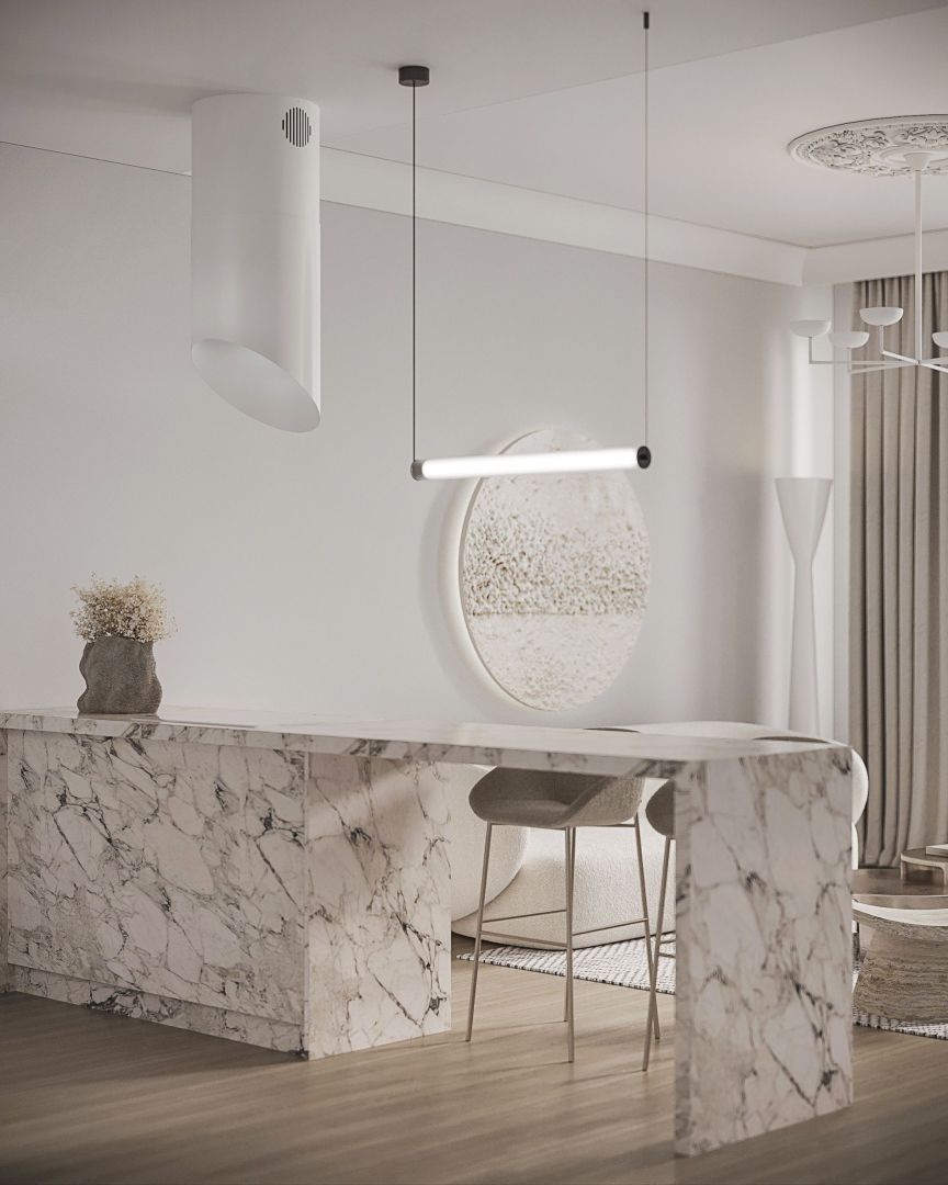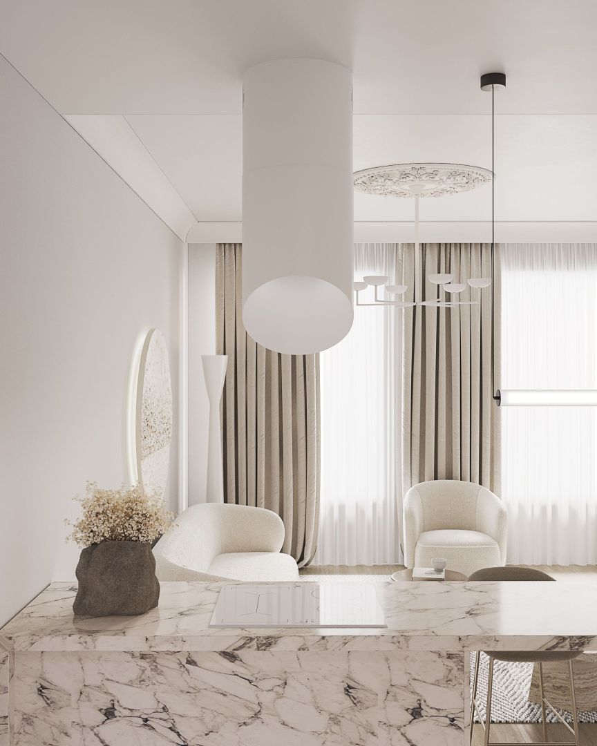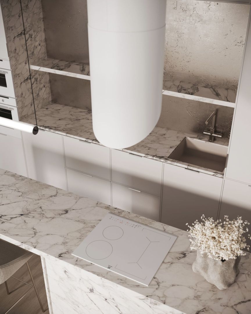 Salas tipa tvaika nosūcējs Nortberg HIRO tiek stiprināts pie grieztiem virs plīts virsmas, kura atrodas virtuves centrā.